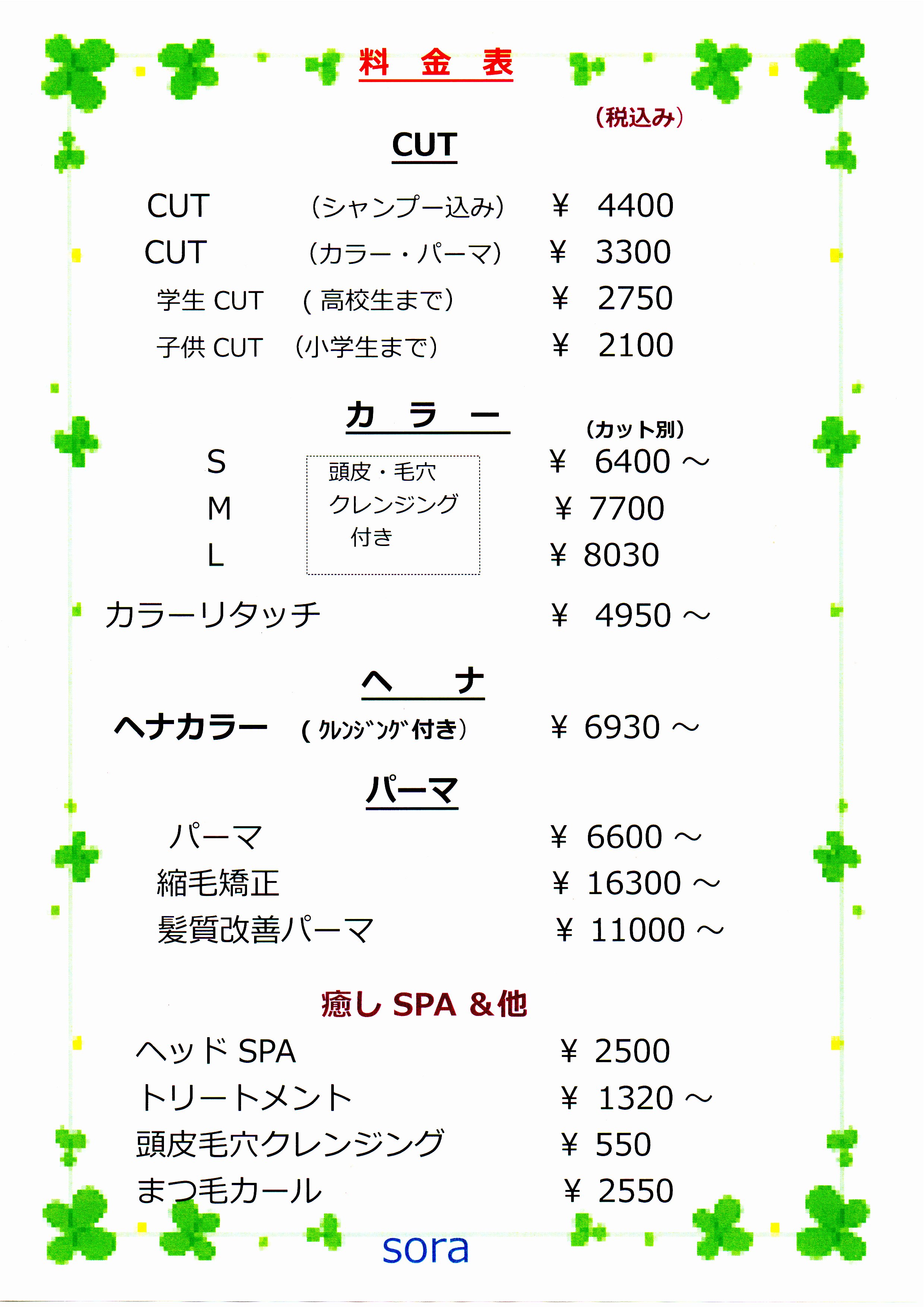 ヘナの魅力 ヘナの魅力は植物ならではの優しさで髪や 地肌を傷めず、艶やかに染め上げます。 また植物100%の自然な香りで染めている 間もリラックスできます。 ヘナ フル ¥6930~ ヘナ ハーフ¥4180 | ![]() |